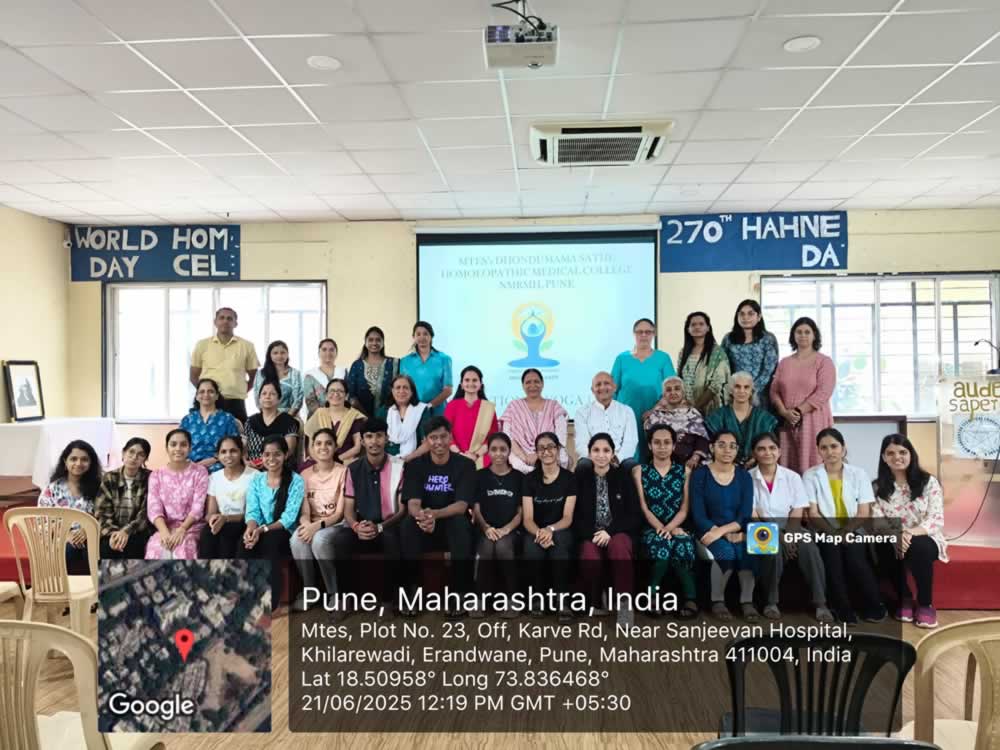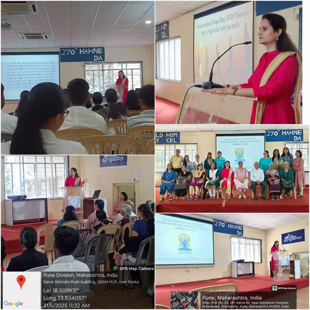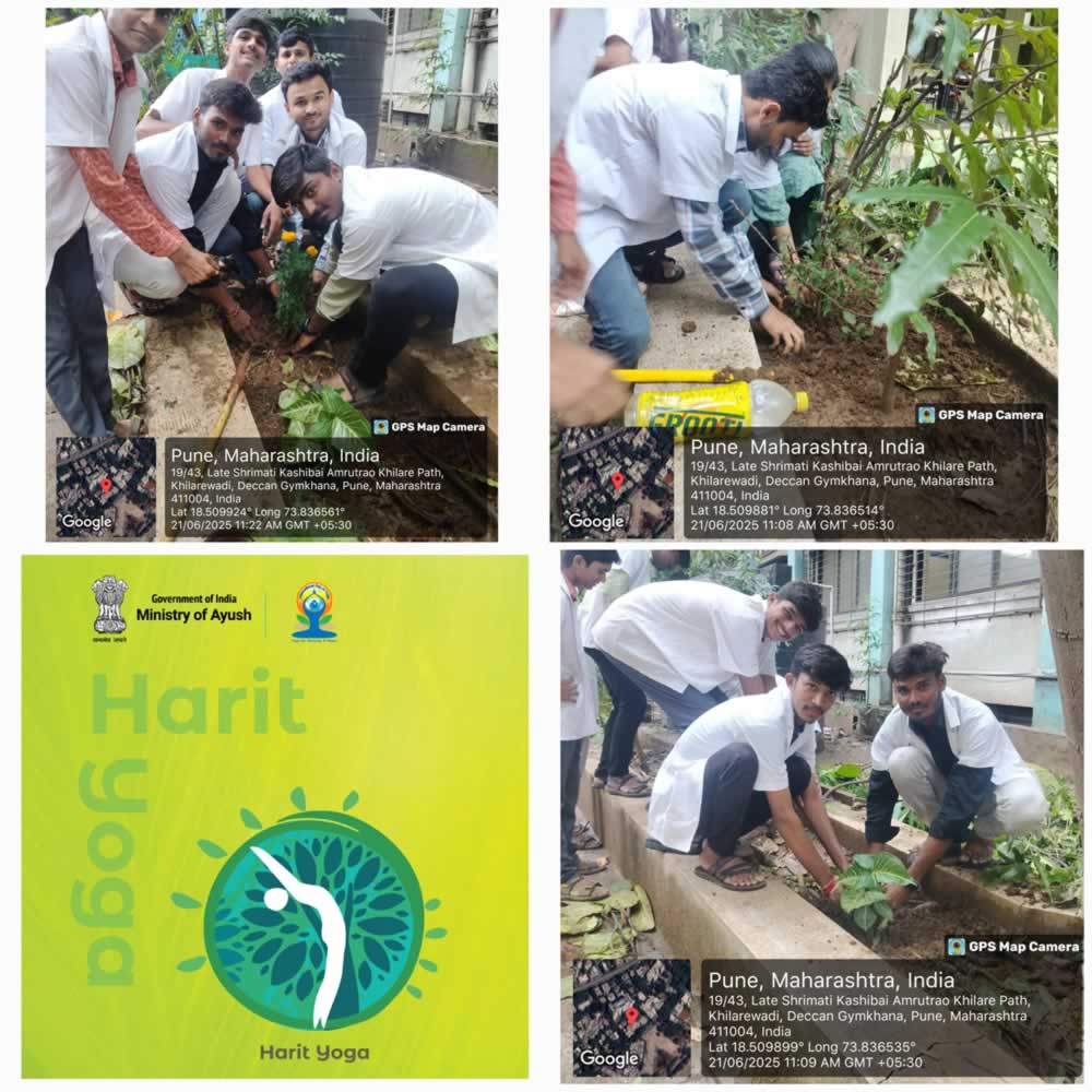 b) “Harit Yoga” emphasizing both personal wellbeing and planetary health. In this event, students planted 20 medicinal plants in our college premises such as Tulsi, Aloevera, Neem, Papaya, Pudina, Marigold, Hibiscus, etc. Post these events, Dr.Harshada Gaikwad took a seminar for the teachers and students explaining various aspects like- Importance of Yoga, Therapeutic Yoga, Benefits of Yoga from practitioners view and its usefulness in treating patients, Yoga as a helping hand in lifestyle disorders imbibing holistic approach with some real time facts and evidences.